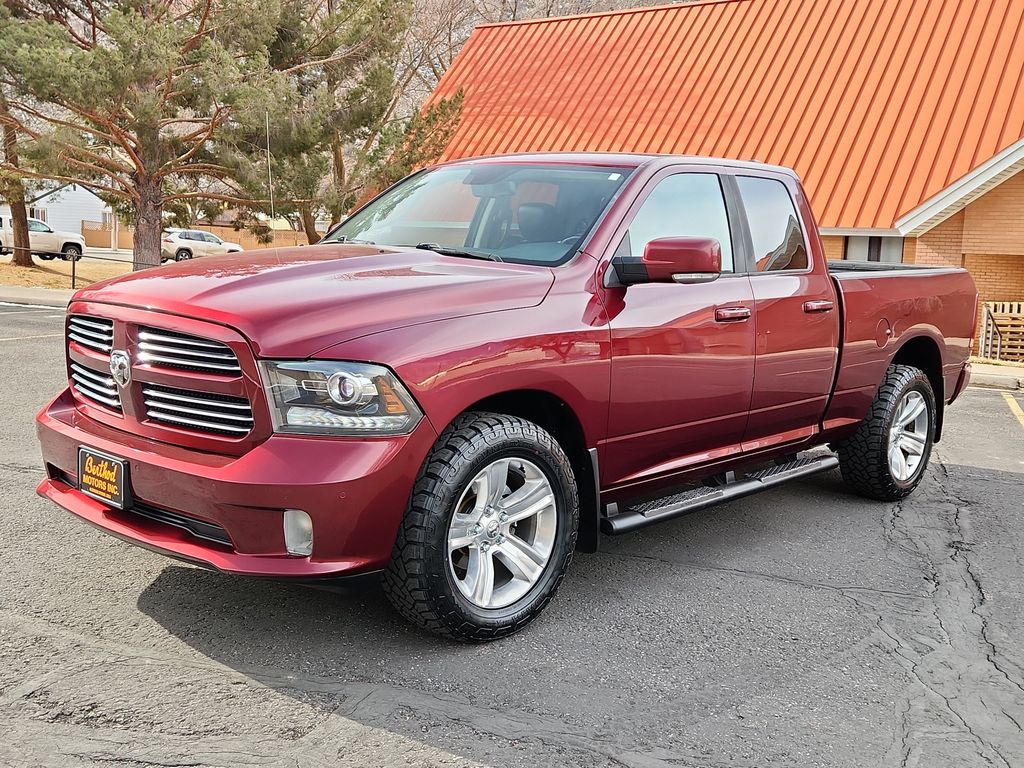Our 2017 RAM 1500 Sport Quad Cab 4X4 inspires confidence in Red Pearl and is in it for the long haul! Driven by a 5.7 Liter HEMI V8 that offers 395hp connected to an 8 Speed Automatic transmission to provide ample power and take you down the road with confidence. This Four Wheel Drive scores nearly 21mpg on the highway, is the epitome of performance, and is certainly up to taking on your big jobs. Add some extra swagger to your day with our Sport that commands the road with fog lamps, body colored grille/bumpers, 20-inch wheels, a bedliner, sport tail lamps, and bi-function projector headlamps.